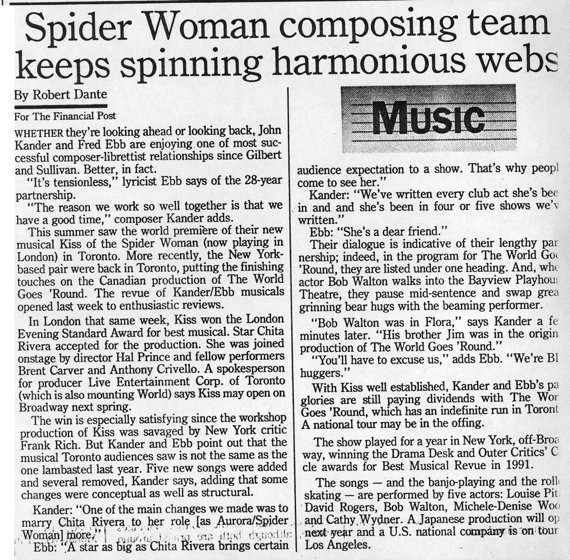 "Spider Woman Composers Kander & Ebb" Financial Post, Toronto, Nov. 1992